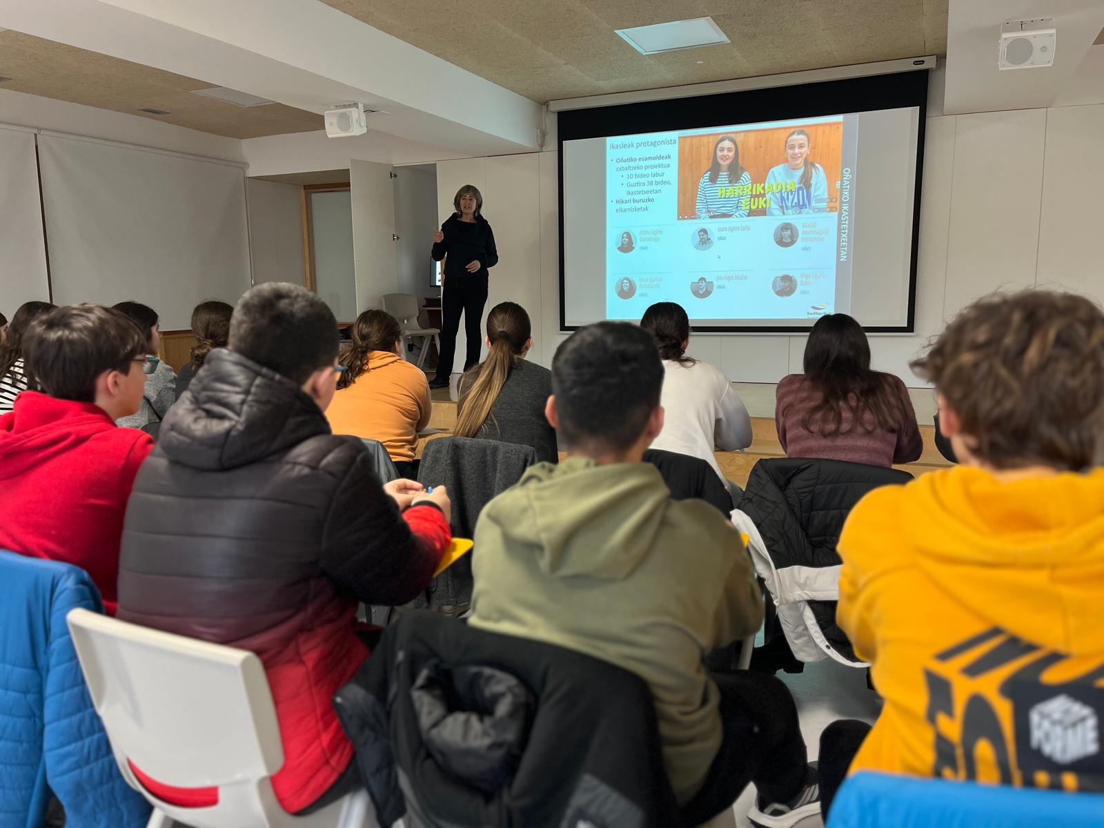 Oñatiko Elkar Hezi ikastetxeko ikasleei elkarrizketak nola egin azaltzen, Ahotsak.eus proiektutik