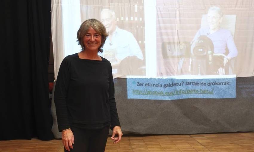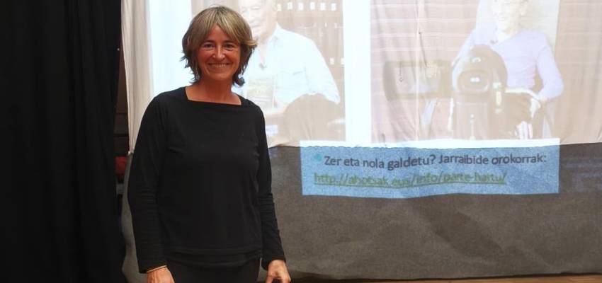 Goiko irudian: Idoia Etxeberria Badiharduguko kidea larunbateko aurkezpeneko une batean. Behekoan: Eskolako ikasleetako batzuk galdetegiari buruzko tailerrean parte hartzen. Iturria: Arabazan